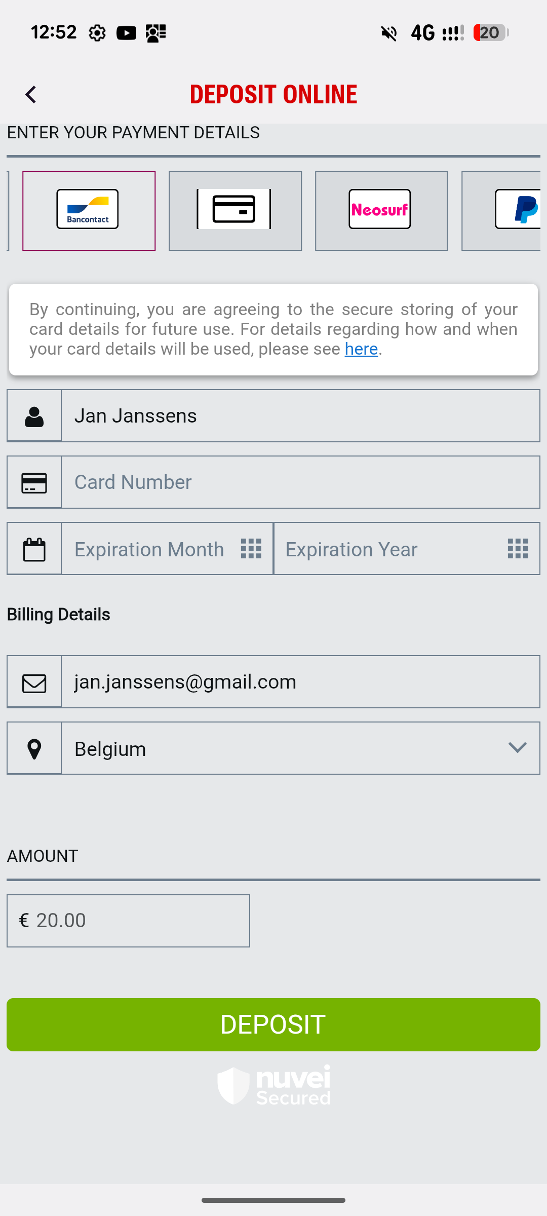 4. Click on the the Bancontact icon on top of the screen and enter your details. To confirm, click on ‘DEPOSIT’.