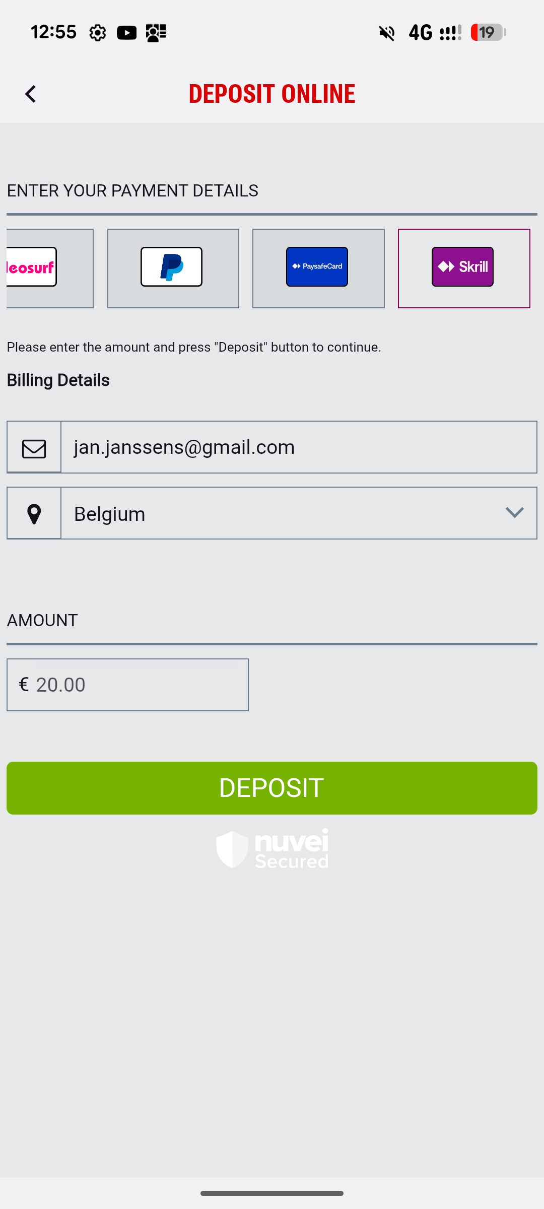 4. Click on the the Skrill icon on top of the screen and enter your details. To confirm, click on ‘DEPOSIT’.