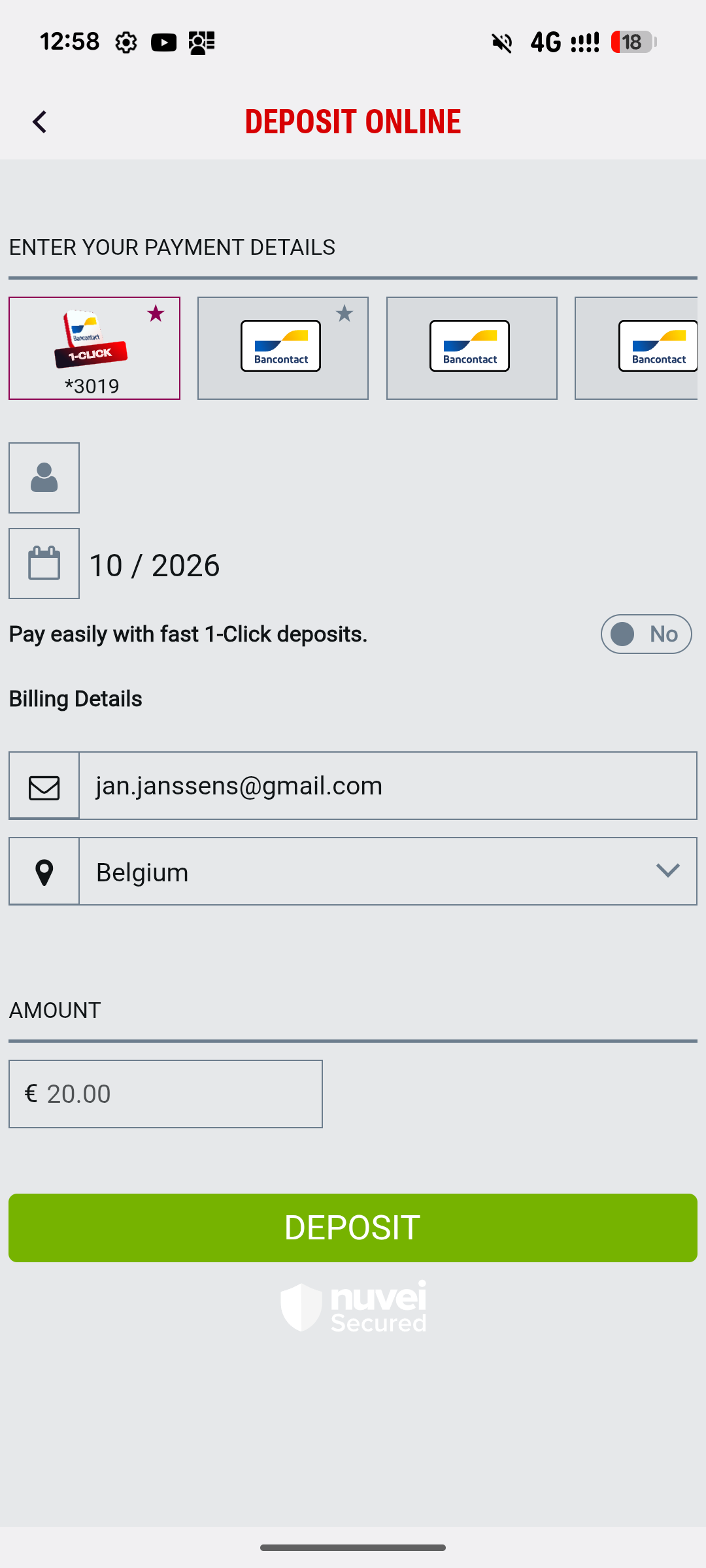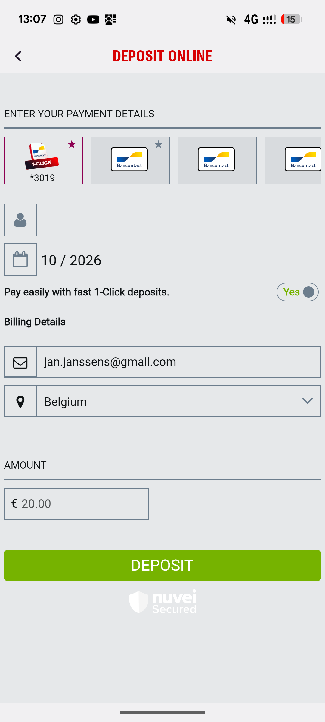 After this first deposit, the Bancontact 1-Click option becomes available on your account.