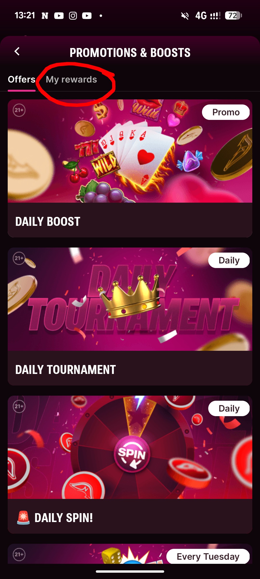 Go to the 'Promos & rewards' section and click on the 'My rewards' tab. There you’ll find an overview of all converted, available and used rewards.