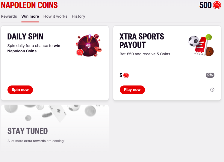 Xtra Payout is the loyalty program at Napoleon Games that lets you earn coins while you play. Coins are awarded automatically and can be used in the Coin Shop for various rewards.