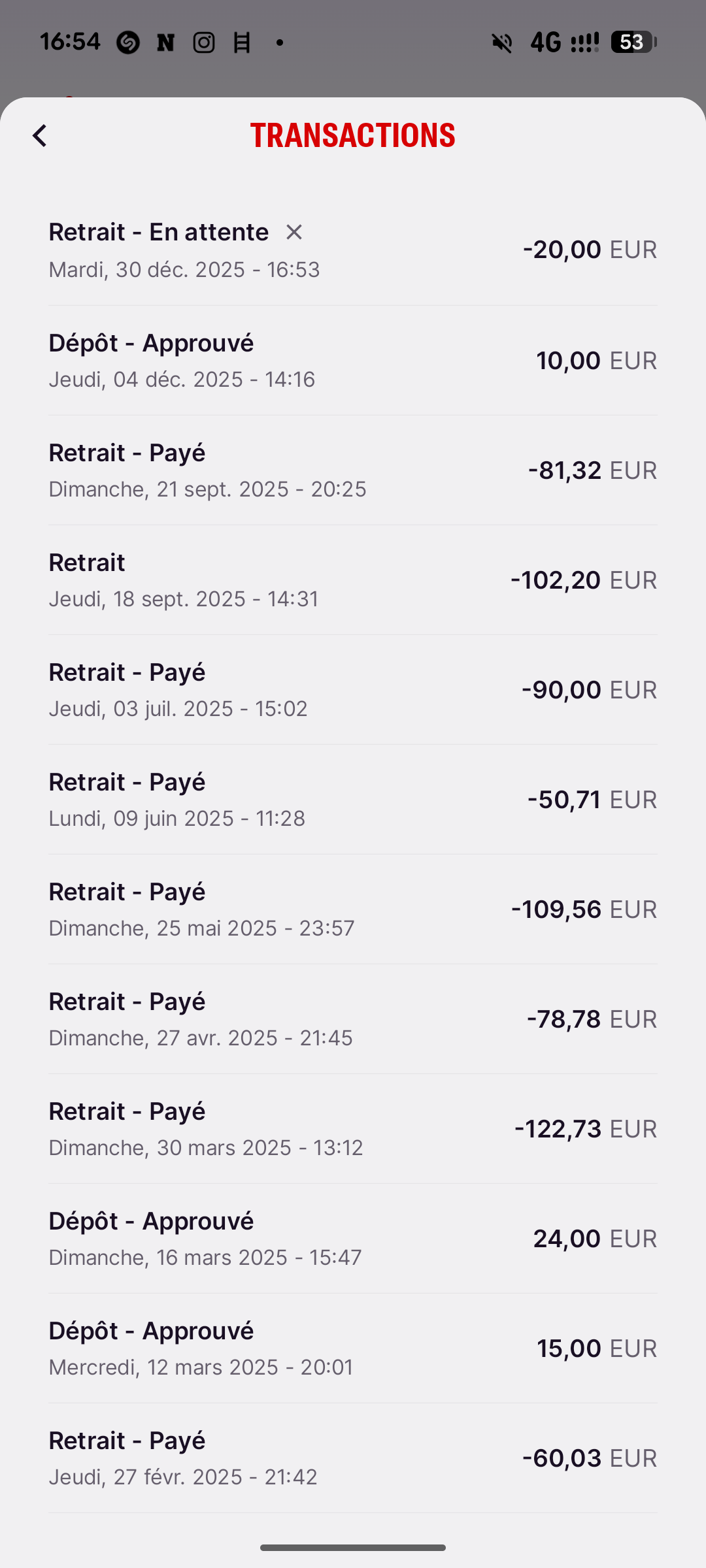 Connecte-toi à ton compte principal, puis clique sur le cercle avec tes initiales en haut de l’écran. Dans ce menu, clique sur « Historique des transactions », puis à nouveau sur « Historique des transactions » pour consulter tes dépôts et retraits.