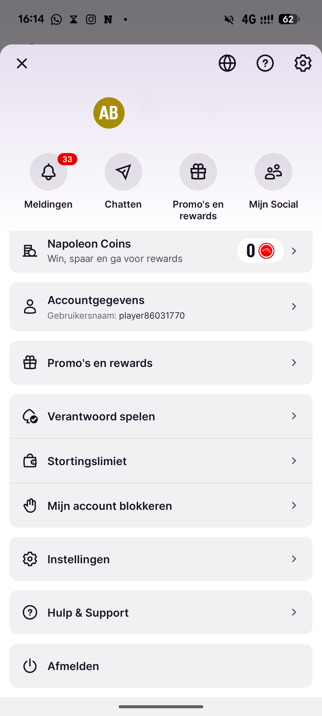 Open het menu door op je profiel (= je initialen) in de bovenhoek te klikken.