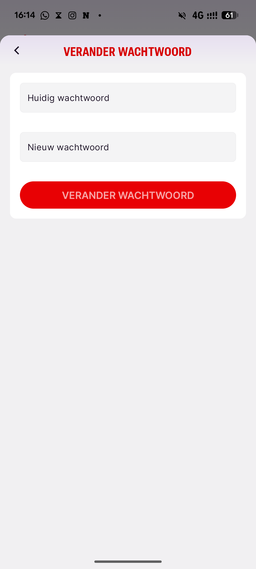 Voer je huidige wachtwoord in, daarna je nieuwe wachtwoord, en klik op ‘VERANDER WACHTWOORD’.