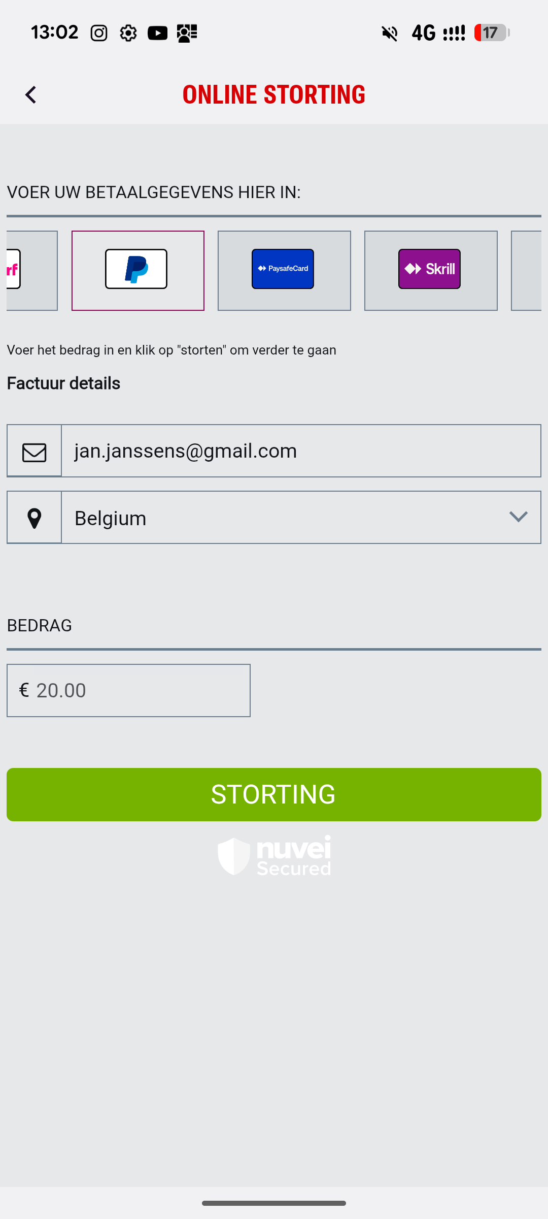 4. Klik bovenaan het scherm op het PayPal-icoon en vul je gegevens in. Bevestig door op ‘STORTING’ te klikken.