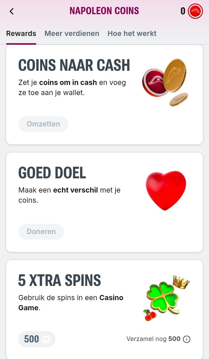 Nee. Napoleon coins kunnen niet direct worden gebruikt om te wedden. Ze functioneren als interne valuta binnen het platform. Eerst spaar je Napoleon coins, daarna wissel je ze in voor geld op je balans of een casino reward.