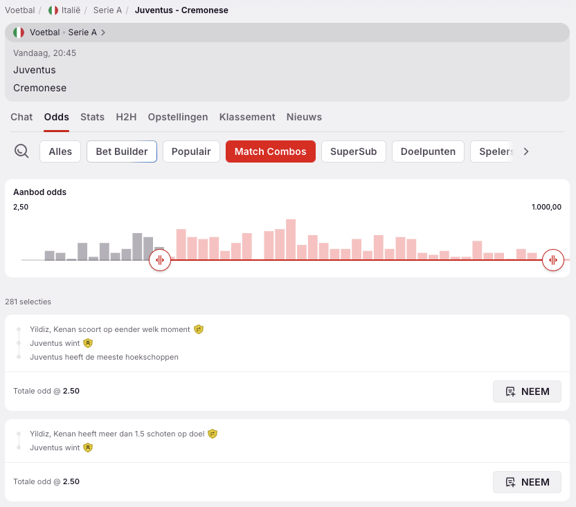 Meestal zijn Match Combos beschikbaar in pre-match. In sommige gevallen kunnen ze ook live beschikbaar zijn, afhankelijk van de wedstrijd en de beschikbare markten.